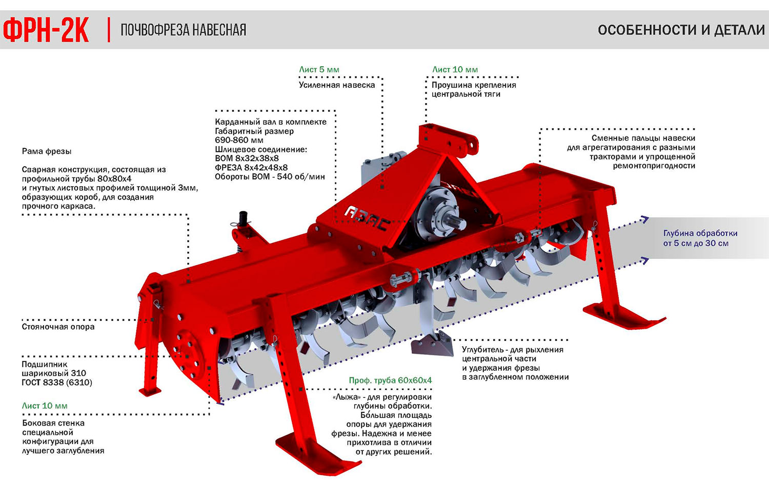 - Частота вращения ВОМ трактора, об/мин: 540.